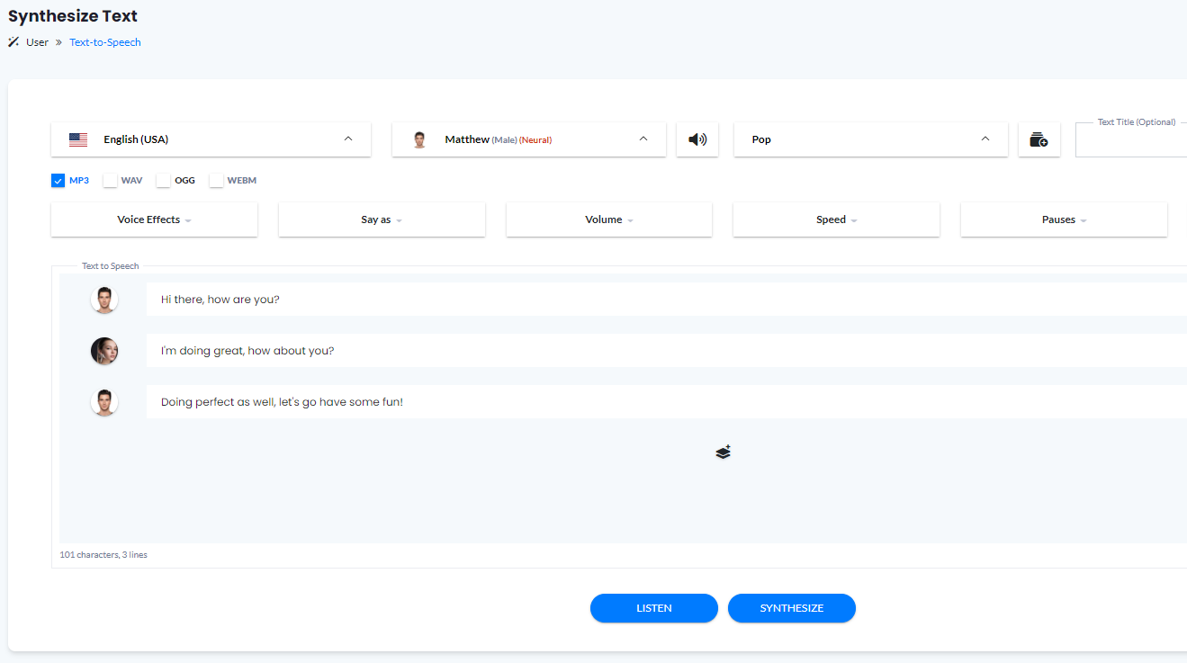 SpeakTTS offers over 850+ text to speech voices. That's more than any other text to speech provider! We have a voice for every need: from natural sounding reads, to hard sells, to IVR prompts, and more. Plus, our voices are available in over 135 languages, so you can reach a global audience.